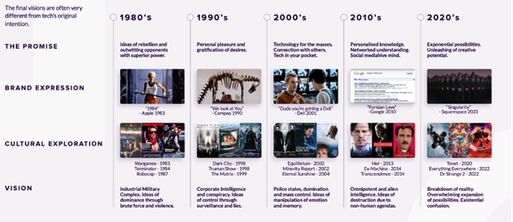 This change is often positioned as a ‘promise’ to society and culture by technology companies through their advertising and communications. In response, these promises are explored by the global imagination through film, TV, books, the news and social media. Ultimately, these explorations lead to a ‘vision’ that is created in the hearts and minds of society and expressed in culture.